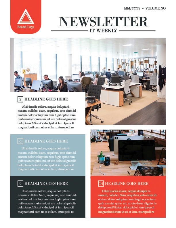 A mock-up newsletter that I made in the style for an IT office. This template is more technical, featuring geometric color blocks. The photographs that I selected were bright and airy, but feel functional.